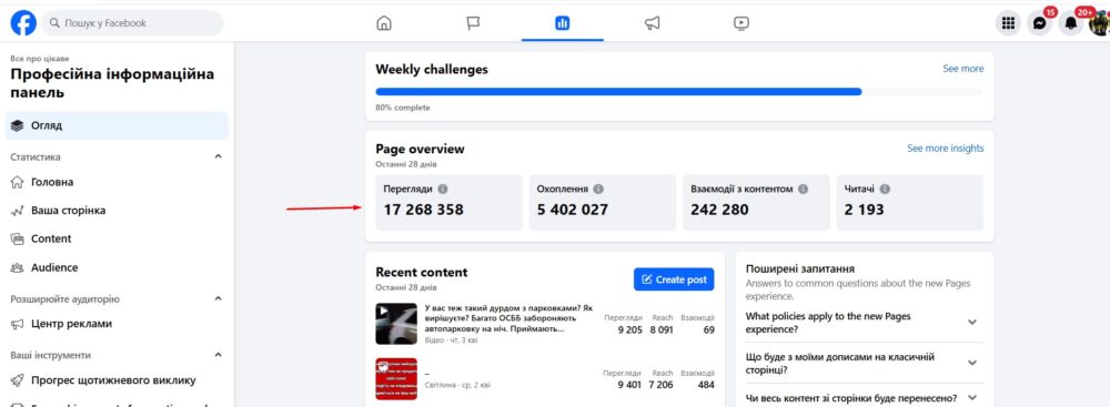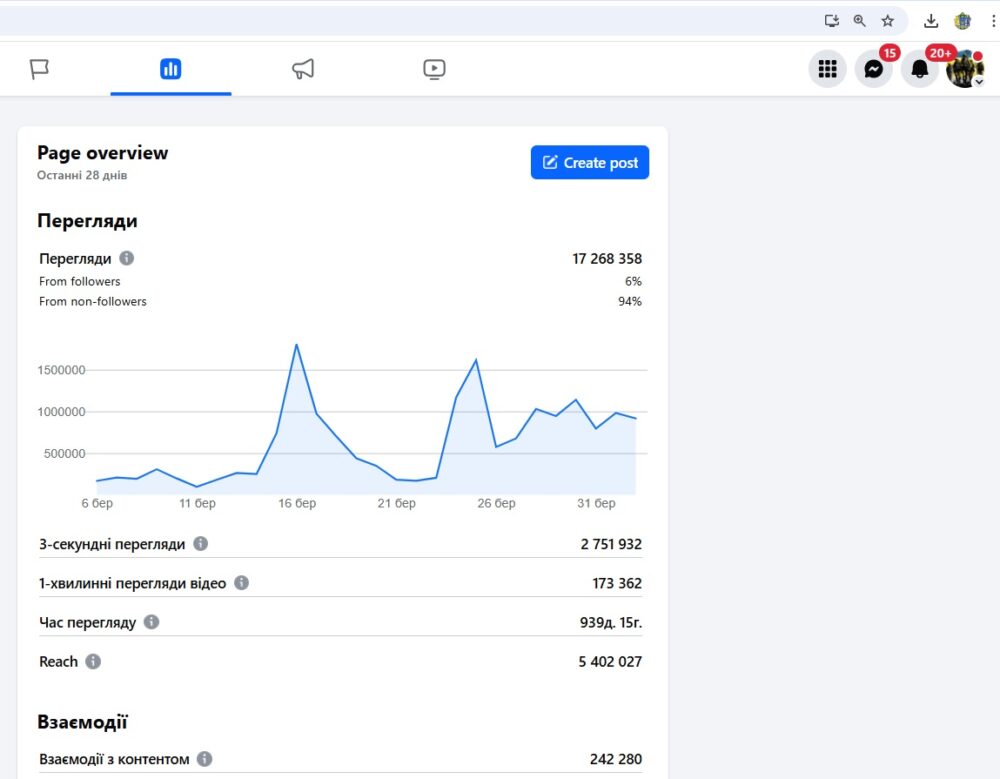 На нашу сторінку у Фейсбуці підписано понад 70 тисяч тисяч фоловерів і її охоплення перегляду постів за останні 28 днів становить понад 17 мільйонів фейсбук-користувачів.