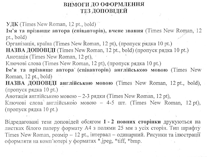 Електронний варіант тез оформлених згідно вимог(див. вище) можна надсилати секретарям секцій до 1 травня 2011р.