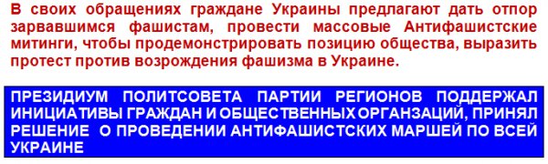 “Инициаторами Антифашистских мероприятий стали граждане Украины, общественные организации, которым небезразлично будущее страны” – тобто не Партія Регіонів та Адміністрація Президента…