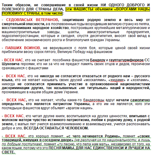 – исповедующих нацистскую идеологию расовой нетерпимости, межнациональной и межконфессиональной вражды, унижающих честь и достоинство граждан Украины по национальным, территориальным признакам, языковым предпочтениям