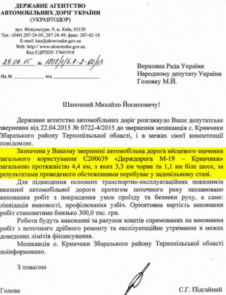 “Уже більше року надсилаю звернення щодо відновлення транспортного сполучення із с. Кривчики Збаразького району. Останні місяці почали приходити позитивні відповіді: заплановано ліквідацію ямкововсті та профілювання узбіччя. Також є позитивний висновок від обласних державних служб щодо можливості відновлення автобусного сполучення із Кривчиками. Дивно, що усі називають різні суму для усунення виявлених недоліків: