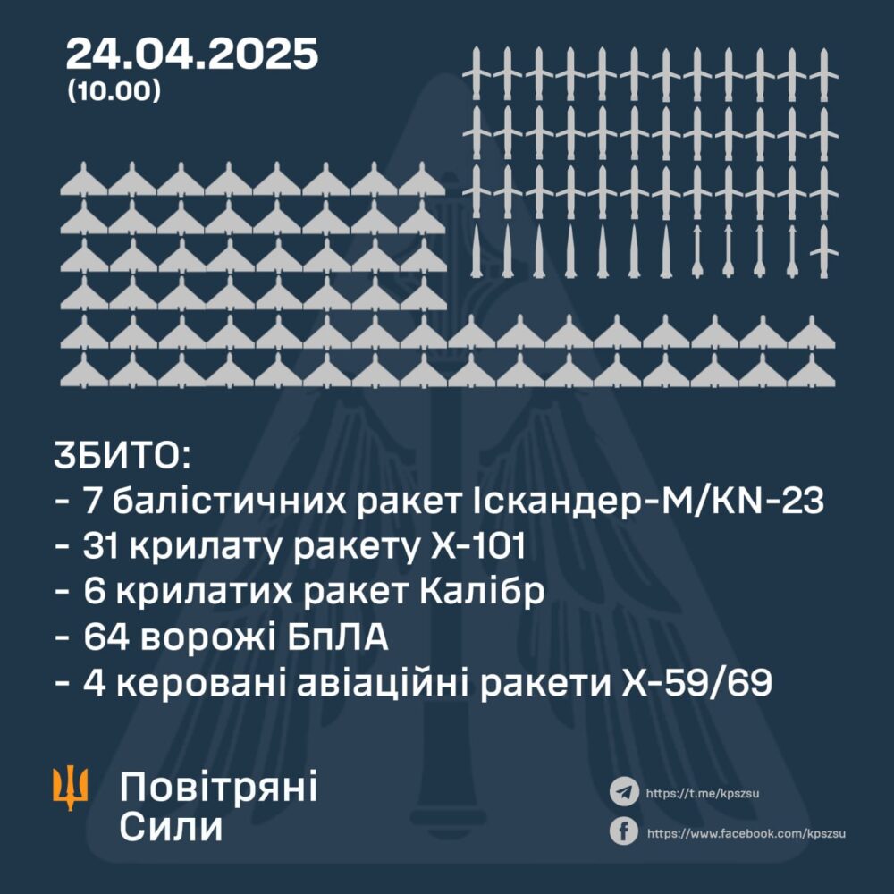 В ніч на 24 квітня росія випустила по Україні 215 ракет різного типу та дронів, основний удар прийшовся по Києву, ППО збила 112 ворожих повітряних цілей, активну участь у відбитті атаки противника брали винищувачі F-16 та Mirage.