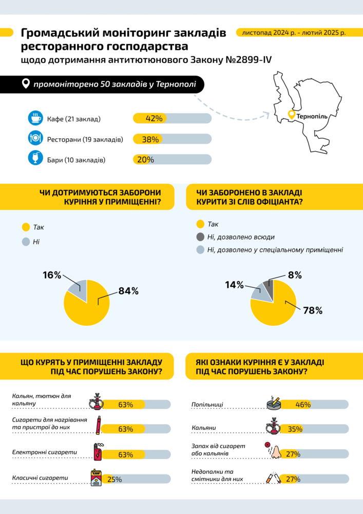 - Лише 9% ресторанів, кафе, барів мають у закладі інформаційне повідомлення або наліпку про заборону куріння, які виглядають відповідно до вимог законодавства (завантажити макет). У Тернополі 18% закладів мають наліпку, яка відповідає Закону, а ще в 32% вигляд наліпки не відповідає законодавству.