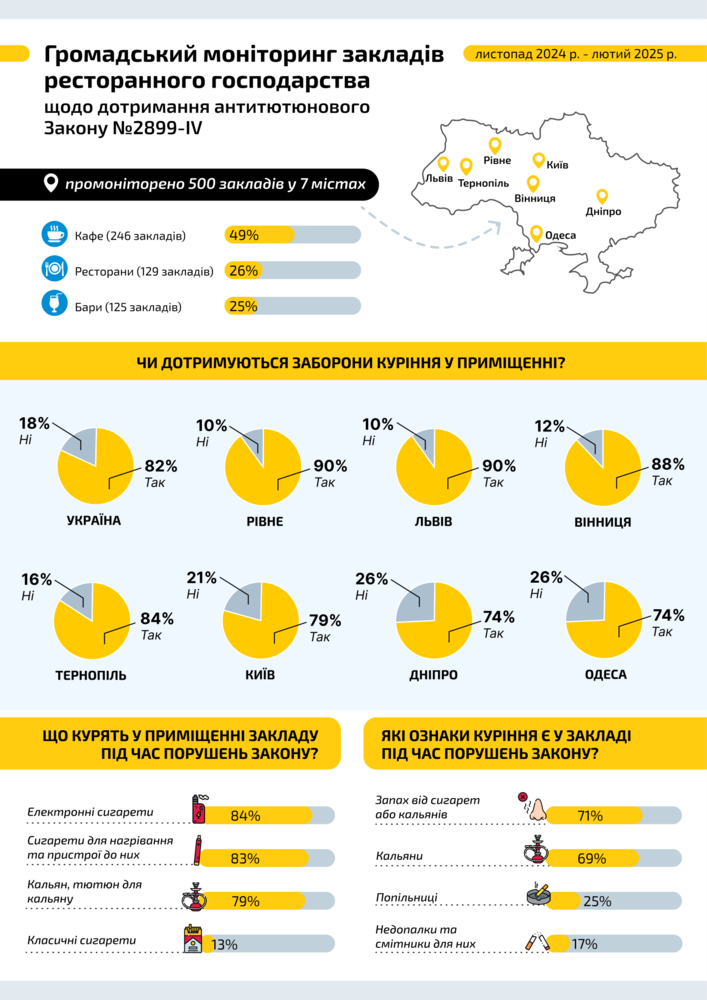 Моніторинг тривав протягом листопада 2024 р. – лютого 2025 р. Волонтери перевіряли, чи дотримуються заклади ресторанного господарства антитютюнового законодавства (Закону України №2899-IV). Нагадаємо, чинне законодавство з 2012 р. забороняє будь-яку рекламу тютюнових виробів, а також куріння тютюнових виробів, електронних сигарет та кальянів у всіх приміщеннях закладів ресторанного господарства. З 2022 року до цього переліку включені тютюнові вироби для нагрівання (так звані айкоси).