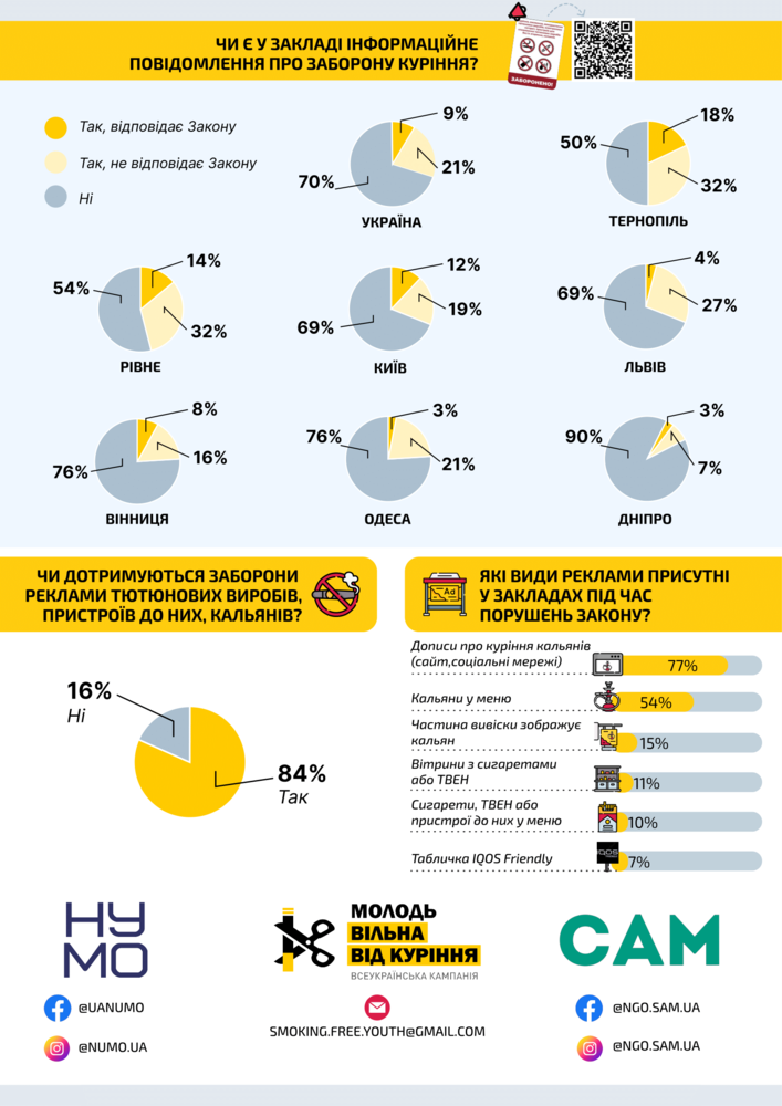 Всеукраїнська кампанія «Молодь вільна від куріння» у партнерстві з Центром громадянського представництва «Життя» представила результати громадського моніторингу 500 кафе, барів та ресторанів у 7 містах: Києві, Львові, Одесі, Дніпрі, Рівному, Вінниці, Тернополі.