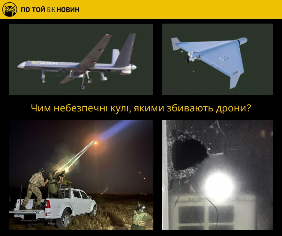 Тому ми вирішили вам нагадати, чим небезпечні кулі, якими збивають дрони. Тим паче, що ми бачимо, як останніми днями наш текст про це активно поширюють у соцмережах. Щоправда його вкрадену версію. Голова правління благодійного фонду «Правота» Ілля Бардін слово в слово опублікував його в себе на сторінці. Ні на автора, ні на “По той бік новин” він не посилається .