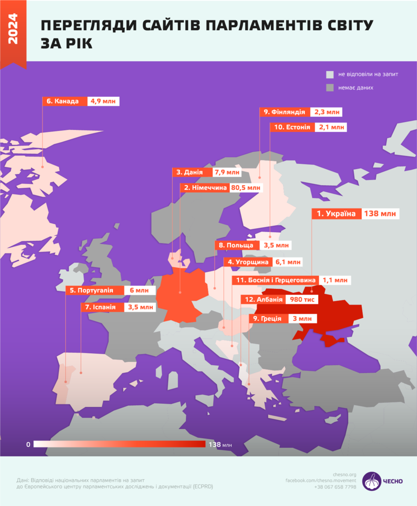 Про це йдеться у дослідженні Руху ЧЕСНО та Дослідницької служби Верховної Ради, під час якого на запит до Європейського центру парламентських досліджень і документації (ECPRD) отримали унікальні дані відвідуваності сайтів парламентів 25 різних країн та Європарламенту.