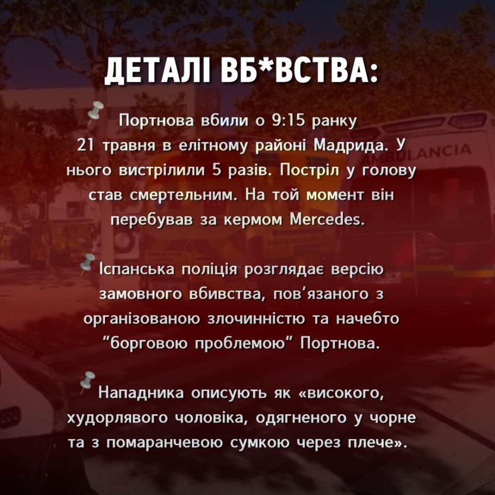 Інцидент стався близько 9:15 ранку біля школи, куди Портнов підвозив дітей. Медики після прибуття лише констатували смерть – його поранення виявилися несумісними із життям. Наразі триває розшук нападника – високого худорлявого чоловіка, який після вбивства втік у напрямку лісопаркової зони Каса-де-Кампо.