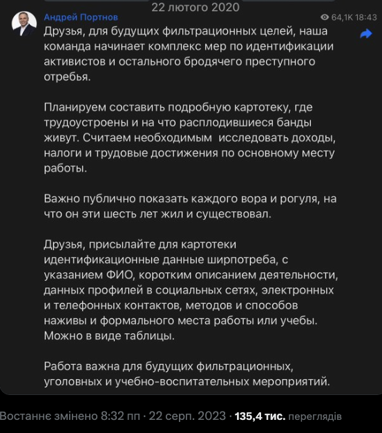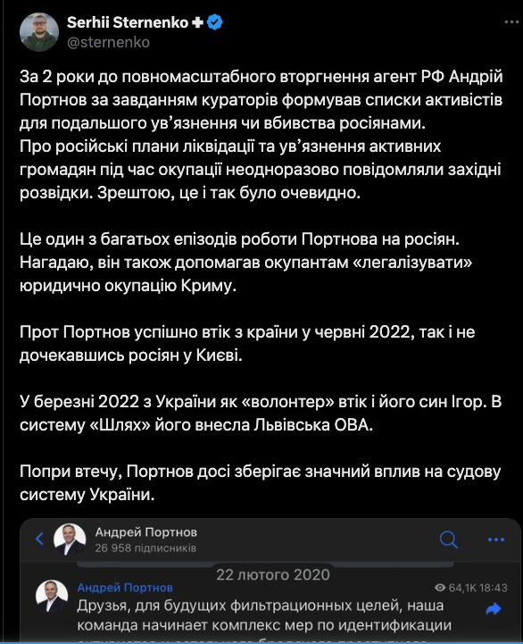 ▪ Рівно за тиждень до вторгнення рф Портнов озвучив тези, які путін майже дослівно повторив перед нападом на Україну.