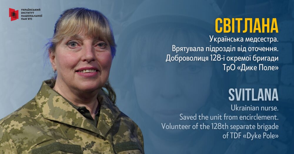 Світлана приєдналася доброволицею до захисту України ще з самого початку повномасштабного вторгнення Росії. В лавах 128-ї окремої бригади ТрО «Дике Поле» її медичні навички неодноразово рятували поранених побратимів. Син медикині, теж доброволець, загинув у боях під Бахмутом, але попри це, вона продовжує свою службу.