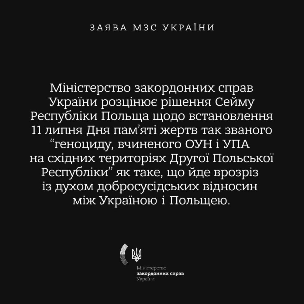 Міністерство закордонних справ України розцінює рішення Сейму Республіки Польща щодо встановлення 11 липня Дня пам’яті жертв так званого “геноциду, вчиненого ОУН і УПА на східних територіях Другої Польської Республіки” як таке, що йде врозріз із духом добросусідських відносин між Україною і Польщею.