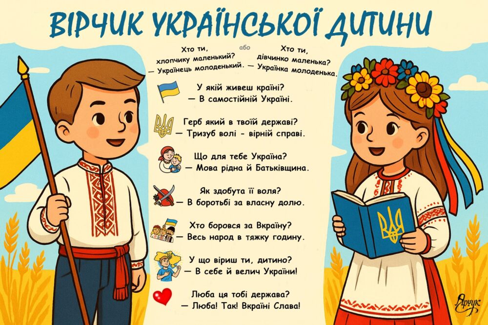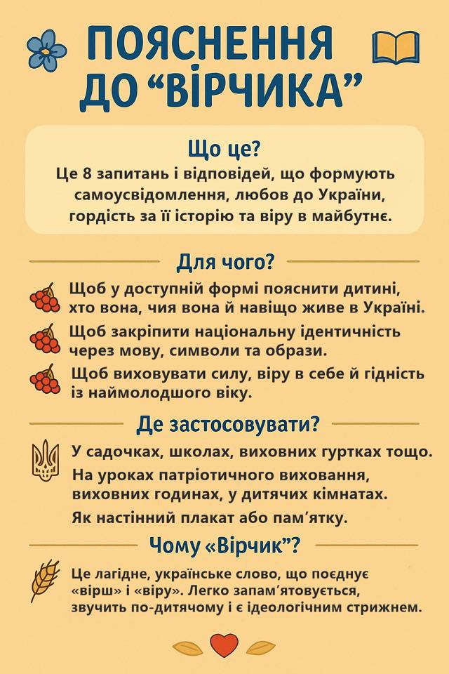 «Вірчик української дитини» — це 8 запитань і відповідей, що формують самоусвідомлення, любов до України, гордість за її історію та віру в майбутнє.
