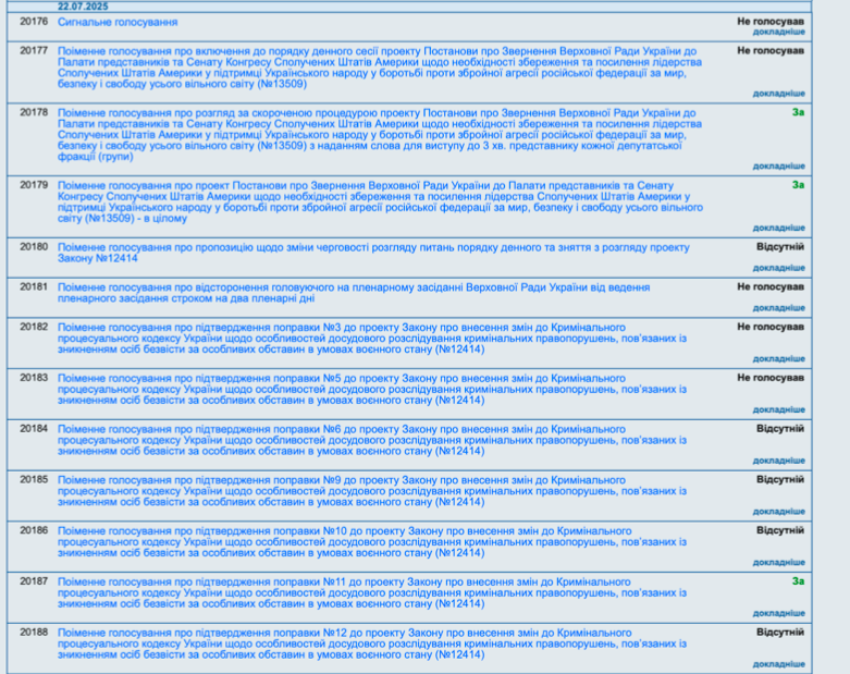 Скриншот голосувань Миколи Тищенка протягом 22 липня 2025 року на сайті Верховної Ради України