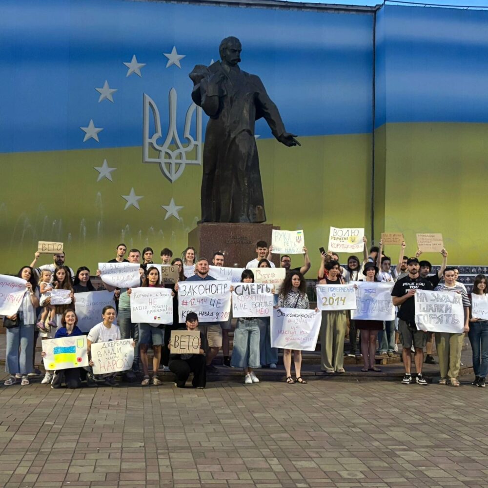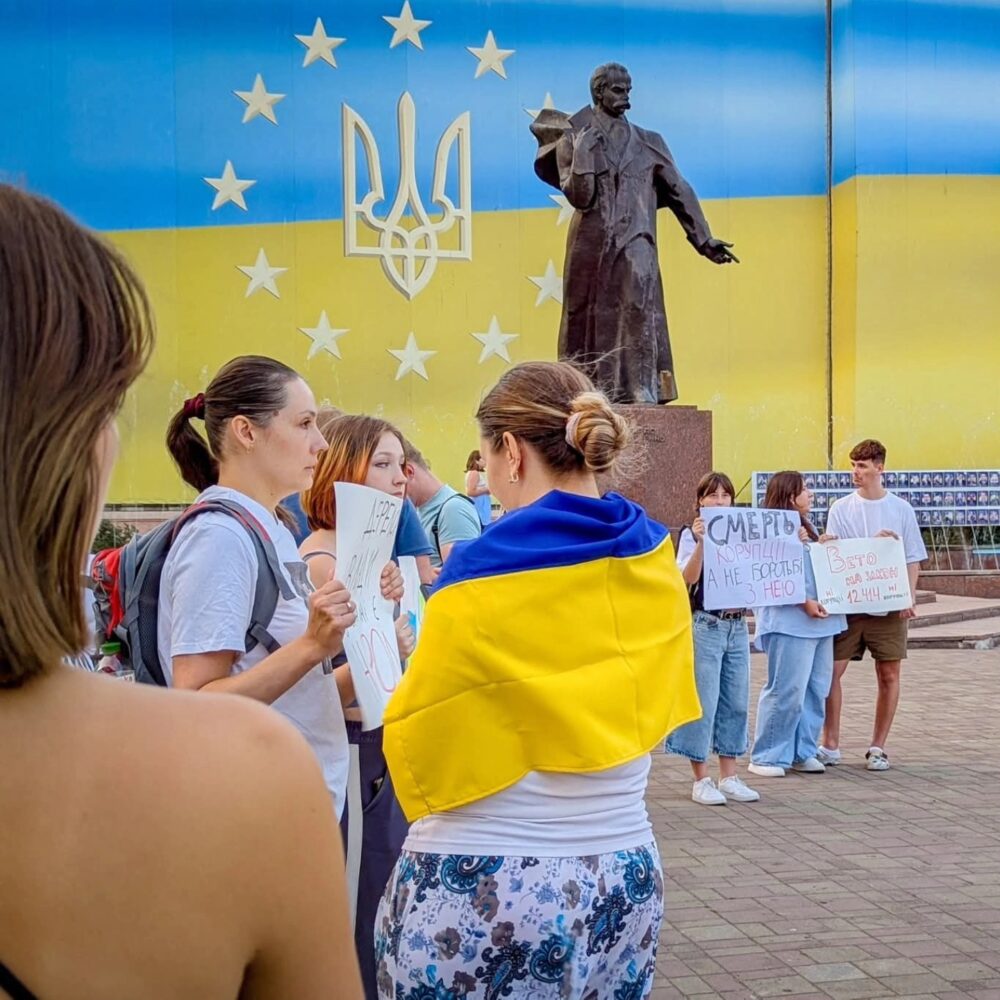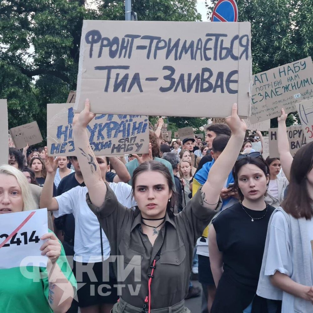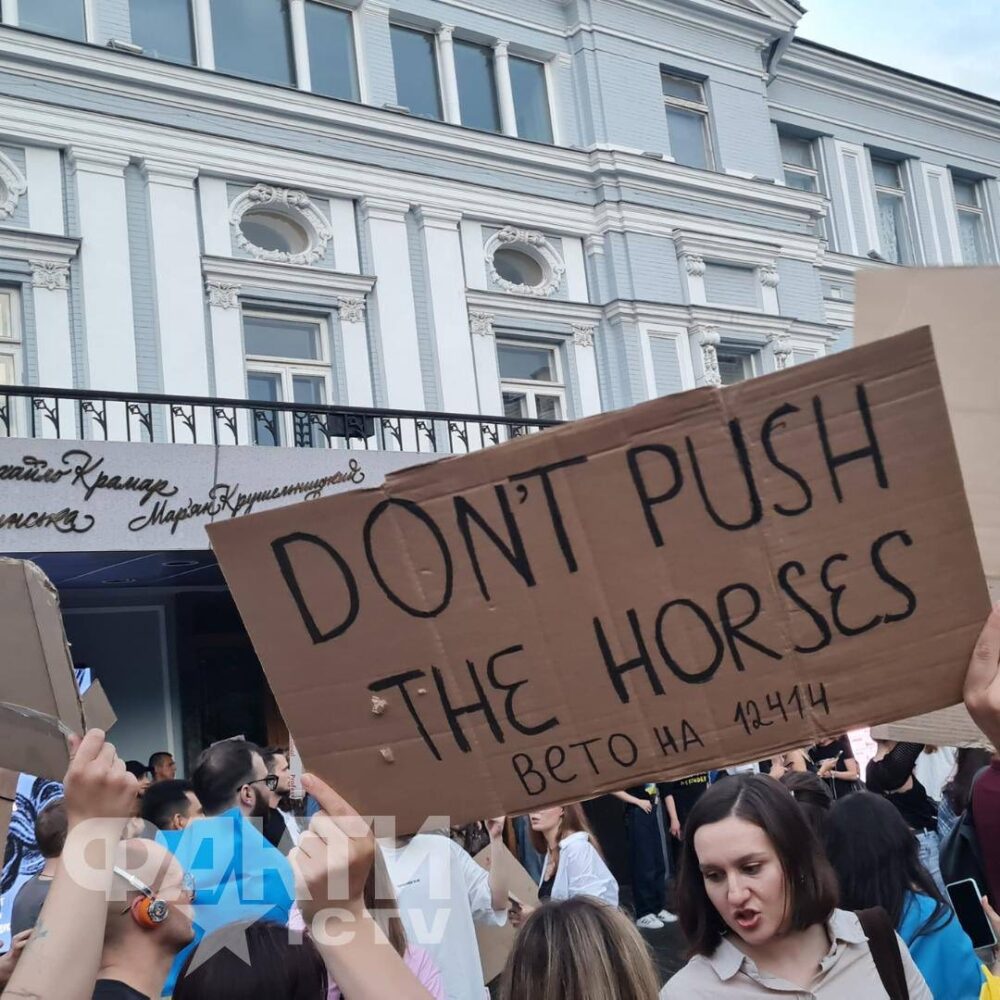 Ви знаєте, що вчора я пішла на мирне зібрання, як і інші люди в інших містах, стосовно прийнятого закону #12414, який скасовує незалежність антикорупційних органів в Україні, що фактично позбавляє нас як євроінтеграційного шляху, так і шансу на міжнародну допомогу, а натомість розв’язує руки тим, хто хотів би безкарно покрити вже зроблені та робити нові корупційні злочини, на жаль. Отже, що було вчора?