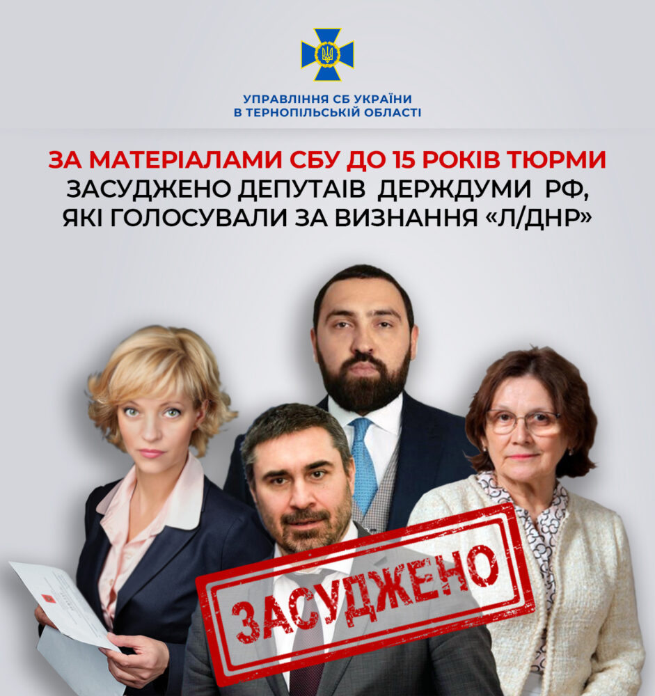 На підставі зібраних доказів Тернопільський міськрайонний суд визнав російських депутатів винними за ч. 3 ст. 110 Кримінального кодексу України (посягання на територіальну цілісність і недоторканність України) і призначив їм 15 років позбавлення волі.