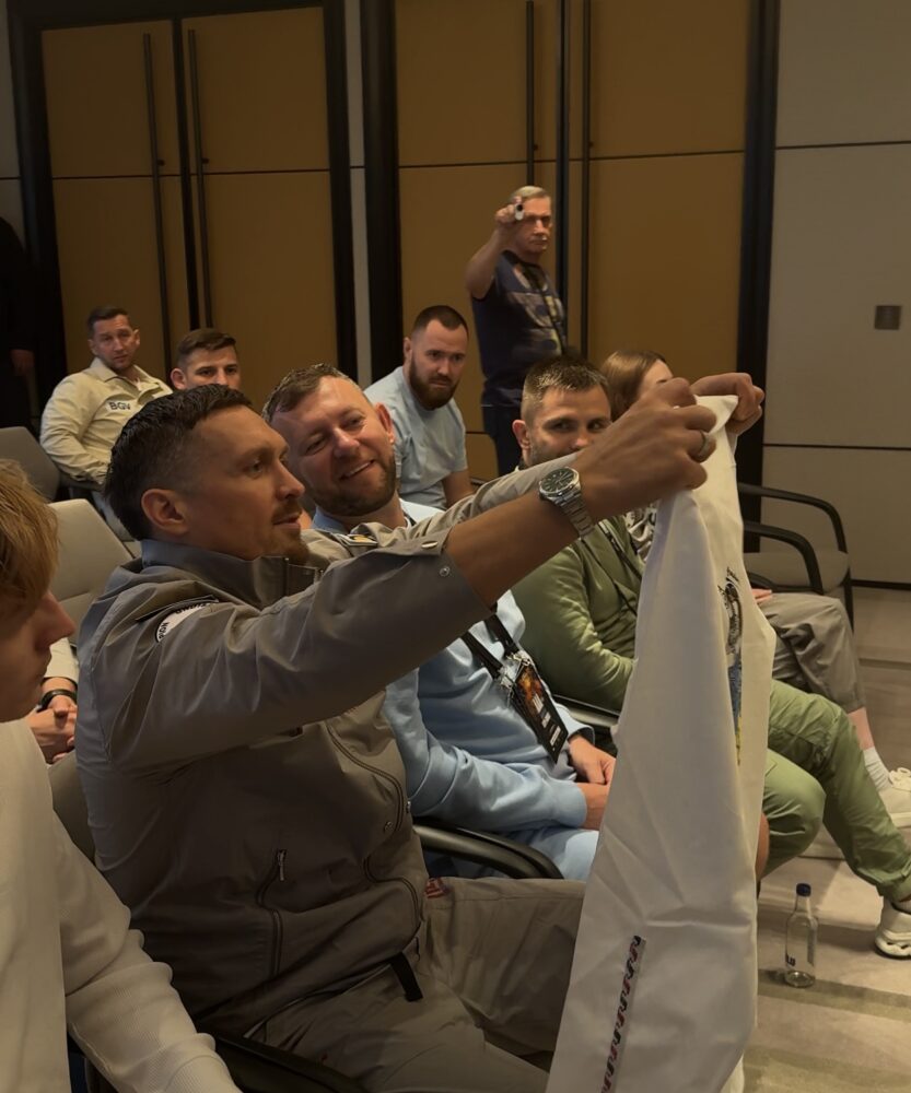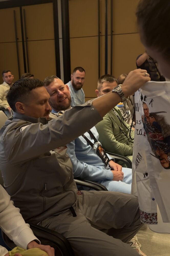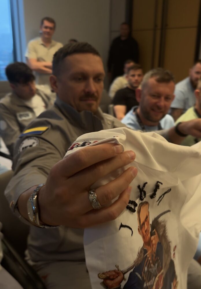 Відома українська дизайнерка Оксана Караванська створила унікальну сорочку для Олександра Усика і передала її боксеру в подарунок у Лондоні у суботу, 19 липня, за лічені години перед матчем-реваншем Усик – Дюбуа. “Десь я в ній з’явлюся”, – відповів Сашко, із захопленням роздивляючись оригінальний презент! Вишита та розписана вручну дизайнерська сорочка з оригінальним змістом – це про віру в перемогу і в Українських героїв.