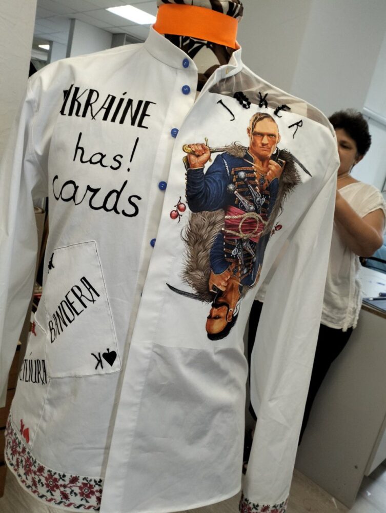 Дизайнерка Оксана Караванська створила ексклюзивну сорочку для Усика-переможця, де зобразила українських героїв сучасності та минувшини – Усика, Бандеру, Петлюру…