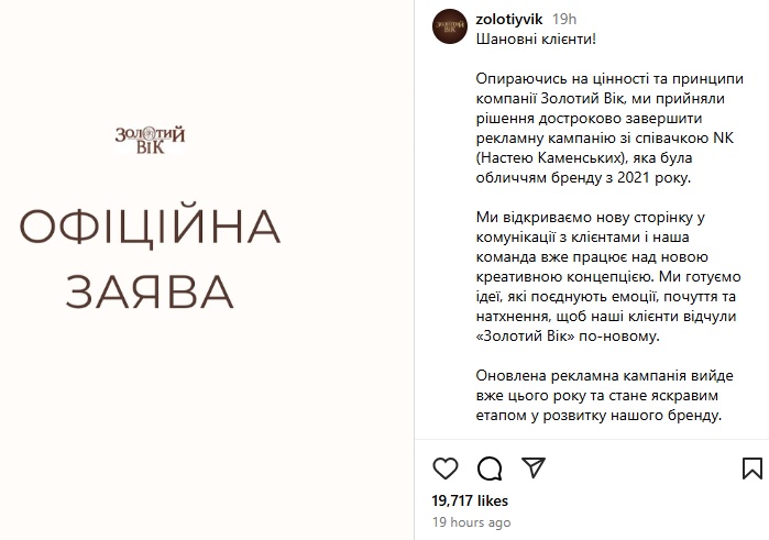 Ювелірний бренд “Золотий вік” припинив співпрацю зі співачкою Настею Каменських (NK) після того, як вона виступила у США з російськими піснями та зробила заяву, що мова не має значення. Про це повідомили на сторінці компанії “Золотий вік”  у п’ятницю, 29 серпня. Там кажуть, що прийняли таке рішення, «опираючись на цінності та принципи компанії». «Ми відкриваємо нову сторінку у комунікації з клієнтами, і наша команда вже працює над новою креативною концепцією. Ми готуємо ідеї, які поєднують емоції, почуття та натхнення, щоб наші клієнти відчули Золотий вік по-новому», — заявили в компанії “Золотий вік”. Оновлена рекламна кампанія вийде вже цього року.  На офіційній сторінці компанії більше немає фото співачки та видалено тег з її іменем. NK була обличчям бренду з 2021 року.