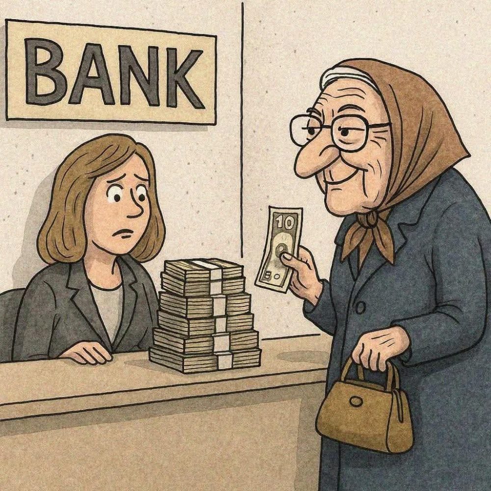 Одна літня пані прийшла до банку, щоб зняти 10 доларів. Касирка, глянувши через скло, сухо відповіла:
