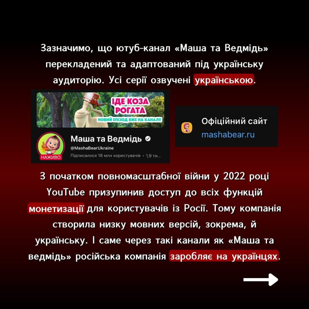 Українська аудиторія, можливо, і не ідентифікує ютуб-канал «Маша та Ведмідь» як російський. Однак посилання в описі ютуб-сторінки ведуть на російський сайт із доменом .ru та на сторінку в соцмережі «ВКонтакті».