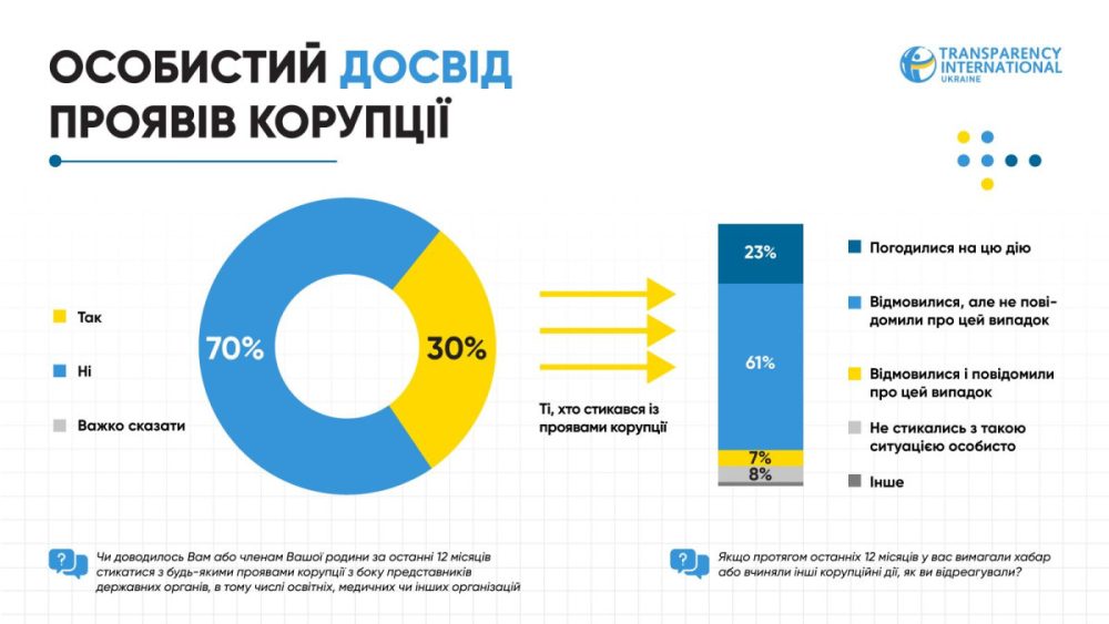 Попри високий рівень сприйняття корупції в цілому, лише 30% українців повідомили, що вони особисто чи члени їхніх родин зіштовхнулися з корупційними проявами протягом минулого року. Серед них погодилися на корупційну дію близько чверті, тоді як 7% повідомили про спробу корупції.