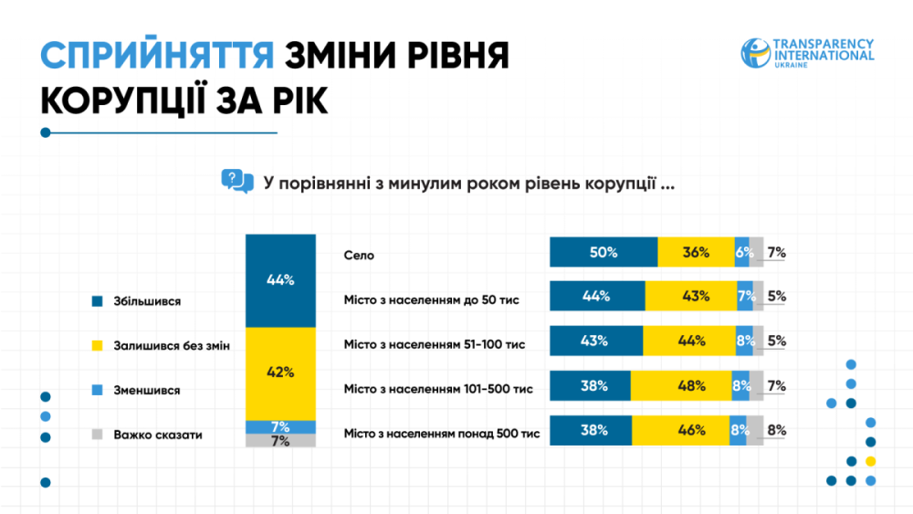 Погляди на динаміку корупції розділилися: 44% респондентів вважають, що її рівень зріс, 42% — що залишився без змін, і лише 7% українців переконані, що рівень корупції зменшився в порівнянні із минулим роком. Найчастіше про зростання корупції повідомляють мешканці сіл (50%), тоді як у середніх і великих містах частка відповідей про зростання корупції нижча.