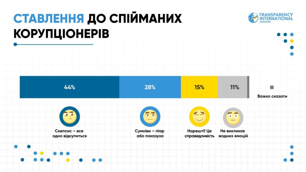 Загалом 72% українців зі скепсисом ставляться до новин про те, що упіймали корупціонера. Здебільшого опитані очікують, що ідеться про звичайний піар з боку правоохоронних органів, або ж що надалі підозрюваний просто відкупиться. Лише 15% респондентів після таких повідомлень відчувають задоволення від реалізованої справедливості.