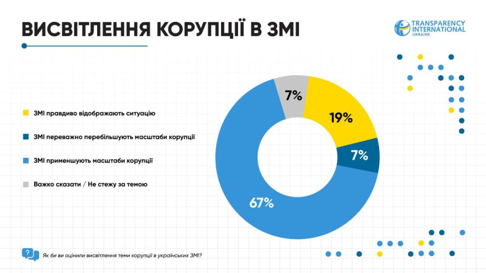 Дві третини (67%) респондентів вважає, що медіа суттєво применшують масштаби корупції в Україні. 20% опитаних згодні з тим, що ЗМІ правдиво відображають ситуацію, і лише 7% говорять про перебільшення висвітлення корупції в українській пресі.