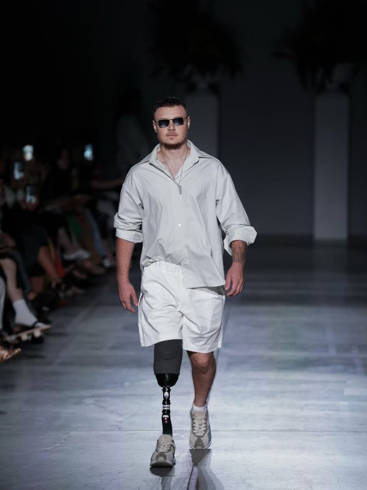 Крім нього, у показі колекції взяли участь ще кілька ветеранів, які втратили в боях кінцівки. «Війна занурила нас у реальність, де адаптивний одяг — не тренд, а необхідність. Ми живемо в країні, де інклюзивність — не виняток, а відповідальність. Це наша нова норма», — вважають засновники Ukrainian Fashion Week.