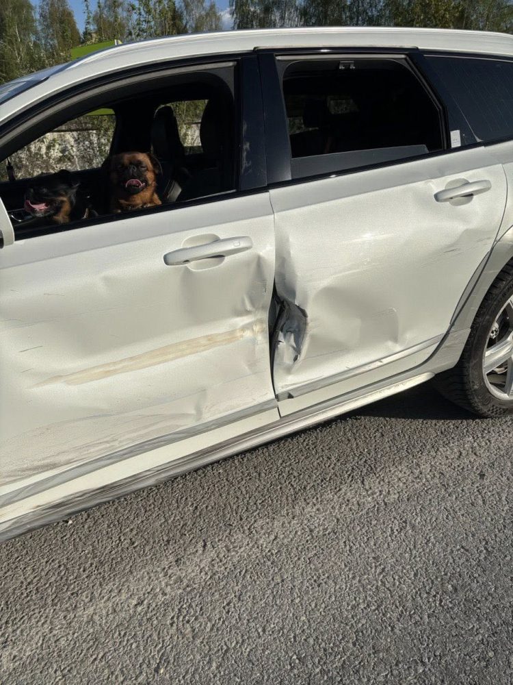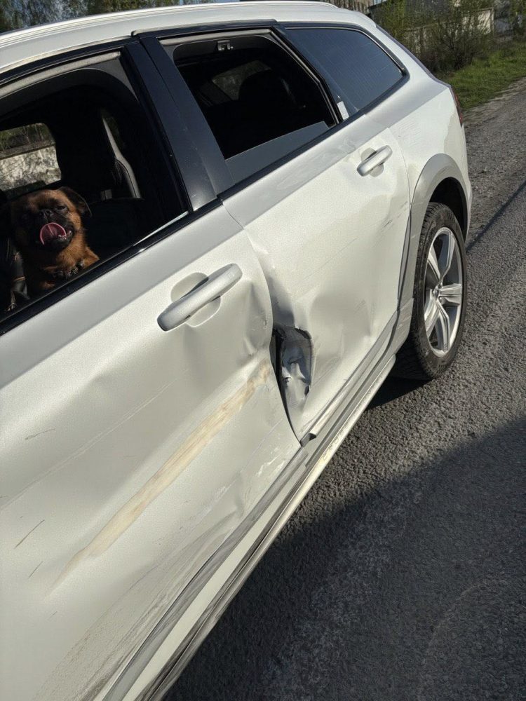 На фото з місця видно: бортовий удар, розбиті ліві двері, деформований поріг, глибокий вхід у метал. Лобова частина — ціла. Ніякого “зустрічного лобового”. Я врятував, а не врізав.