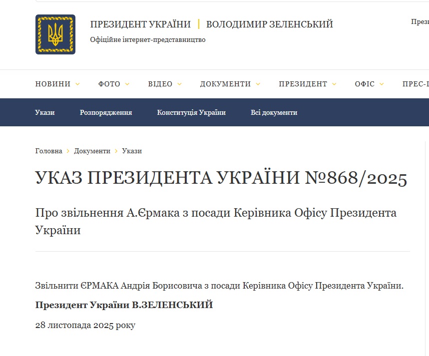 Президент Володимир Зеленський звільнив із займаної посади керівника Офісу президента Андрія Єрмака. Про це він повідомив у своєму вечірньому зверненні та підписав відповідний указ.