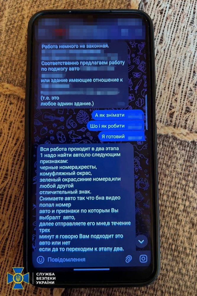 Слідчі СБУ встановили, що ворог дистанційно завербував фігурантів через Телеграм-канал з пошуку «легких заробітків» та доручив їм знищити позашляховик, що належав українському військовому.