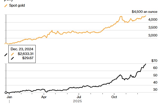 Ціни на золото та срібло злетіли до історичних максимумів, оскільки ескалація геополітичної напруженості та ставки на подальше зниження ставок у США додали імпульсу найкращим річним показникам за понад чотири десятиліття.
