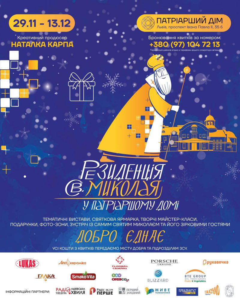 Від 29 листопада до 13 грудня в Патріаршому Домі у Львові (проспект Івана Павла ІІ, 35б) уже третій рік поспіль працюватиме одна із наймасштабніших Резиденцій Святого Миколая в Україні. Щороку у цій особливій, по-родинному теплій та затишній локації, яку на добрі справи благословив Глава Української греко-католицької церкви Блаженніший Святослав Шевчук, збираються тисячі маленьких українців – й на їхніх очах творяться справжні дива. На урочисте відкриття Святий Миколай приїхав на ошатній колісниці – й так розпочалася двотижнева яскрава пригода, яка не залишає байдужими ні малих, ні великих.