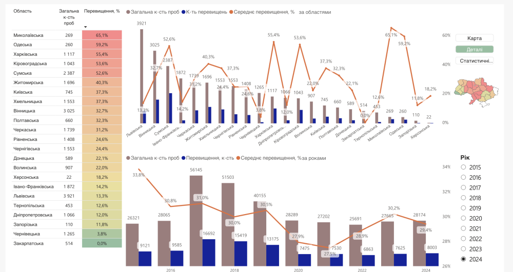 Мапа охоплює дані за 2015–2024 роки та створена ГО «Екодія» на основі результатів лабораторних досліджень, які проводять обласні центри контролю та профілактики хвороб МОЗ України.