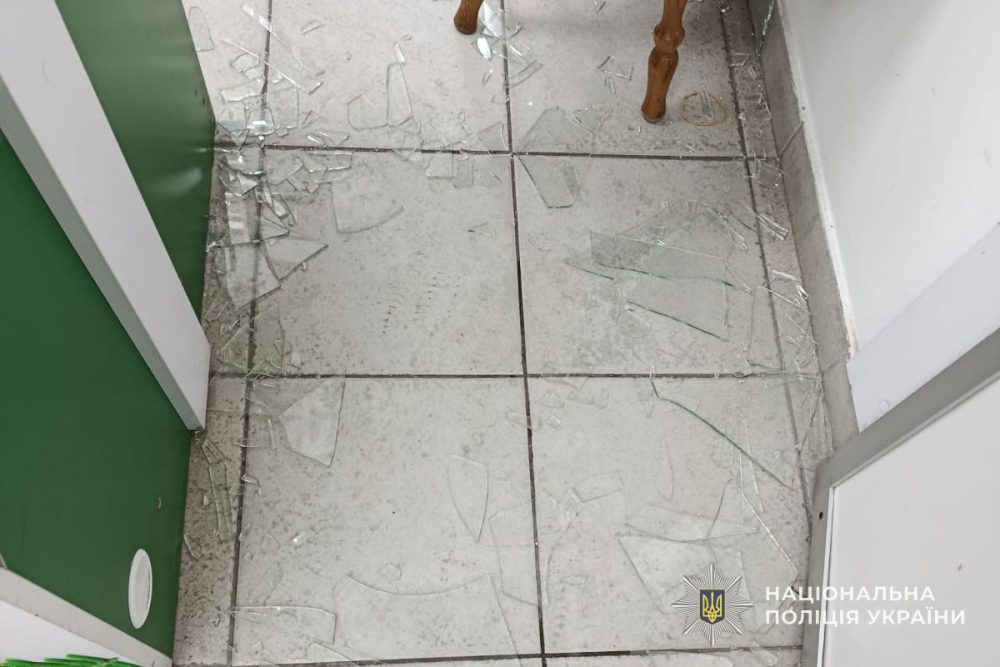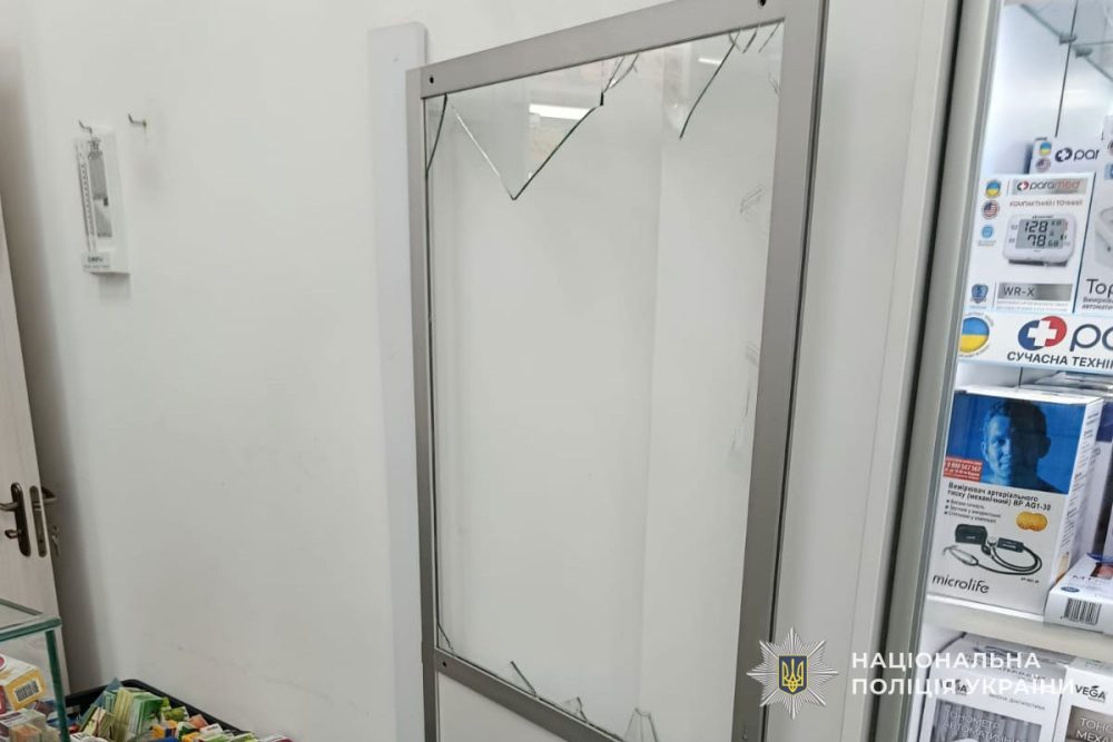 Прибувши на місце події, поліцейські припинили протиправні дії чоловіка. Під час інциденту фігурант розбив скло у дверях аптеки. Сума завданих збитків склала 5 тисяч гривень.