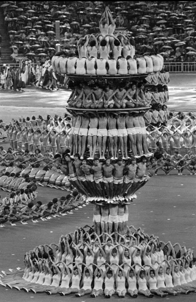 Це кадр з церемонії відкриття Літніх Олімпійських ігор на болотах, 1980. Радянська влада тоді робила “шоу століття” — масові постановки з тисячами учасників, щоб показати світу картинку “мирної, сильної, щасливої” держави.