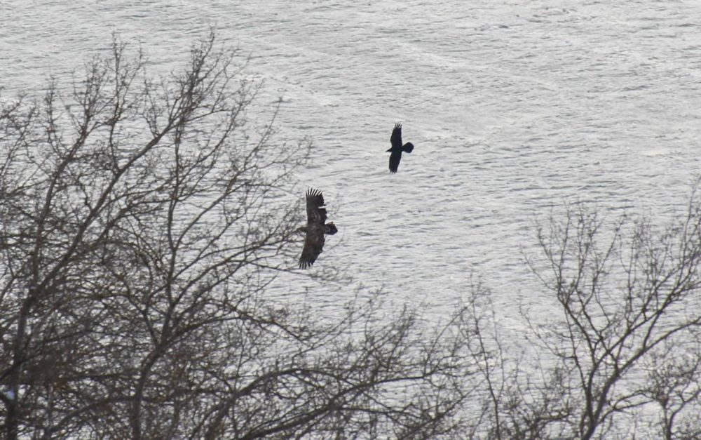 Швидка течія , що вирує на звуженій між островами руслі довго не дає річці вкритись кригою. На відкритій воді проводять довгі зимові ночі і короткі дні понад 500 крижнів і близько 60 лебедів.🦆🦢 Кілька років поспіль спостерігаємо тут найбільшого хижого птаха Європи орлана білохвостого.🦅 Він у нас не гніздиться, прилітає тільки на зиму. На краях криги чатують на рибку білосніжні чепури великі, час від часу пролітає блакитний рибалочка, який теж тут знаходить можливість прохарчуватись. Між островами збереглись мілкі проталини, які дають шанс вижити хороброму кулику , що зветься баранець звичайний ( хоробрий, бо