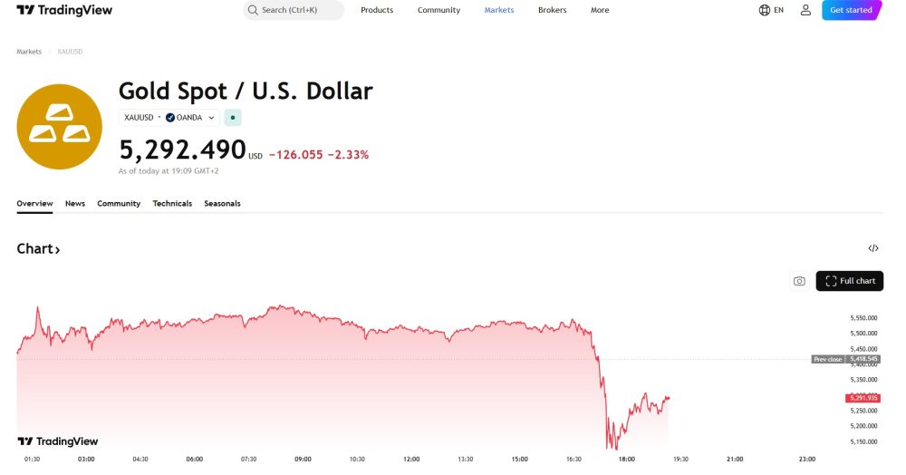 Золото різко подешевшало за 15 хвилин торгів, спотові котирування впали з $5505 за унцію о 17:00 до $5098 о 17:15. Це випливає з даних TradingView.