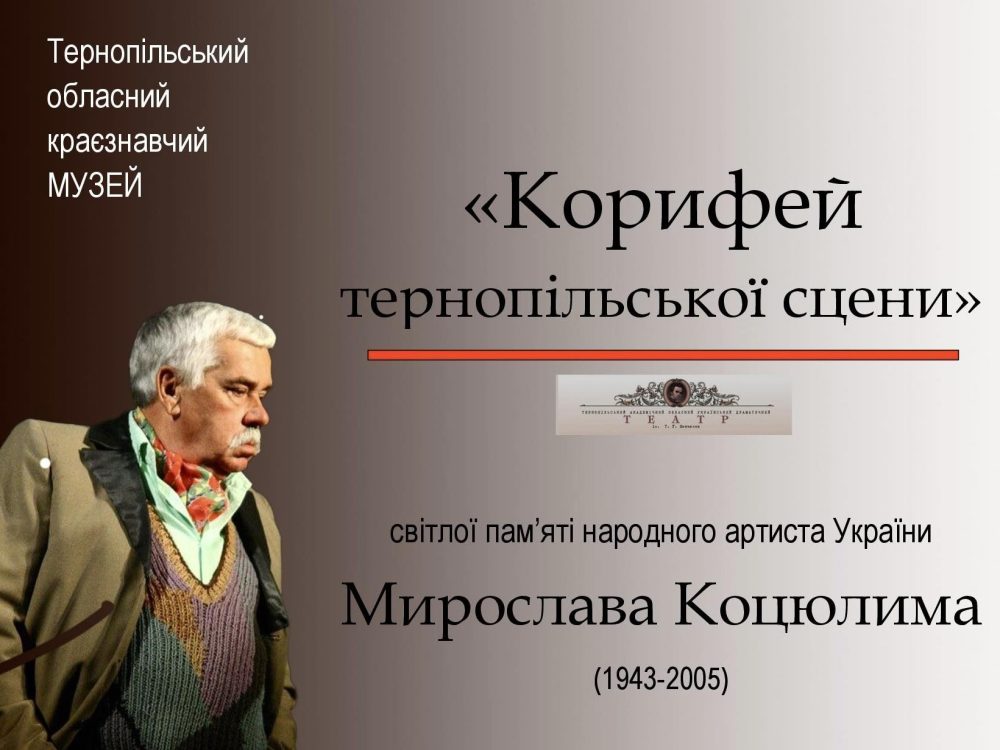Тернопільський обласний краєзнавчий музей презентує виставку 🎭 «Корифей тернопільської сцени» (світлої пам’яті народного артиста України Мирослава Коцюлима (1943-2005)).