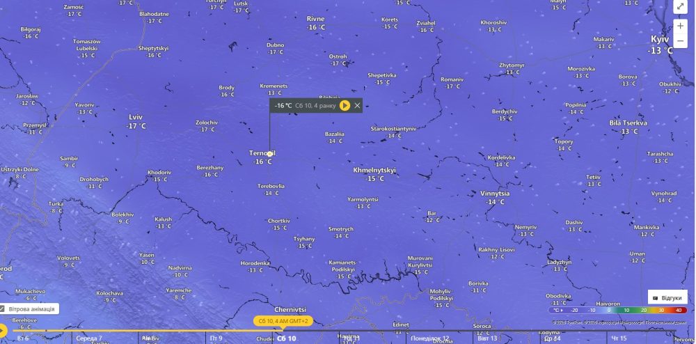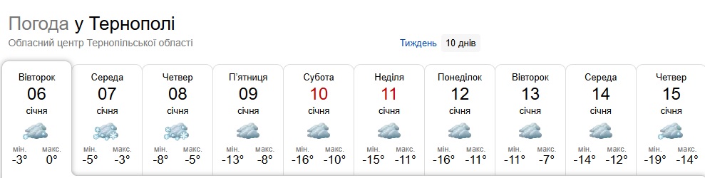 У наступні три доби складні погодні умови. У західних областях часом сніг, 7 січня на Закарпатті та Прикарпатті, 8 січня повсюди значний сніг, температура 7 січня впродовж доби 2-7° морозу, 8-9 січня зниження вночі до 10-16° морозу, вдень до 4-9° морозу”