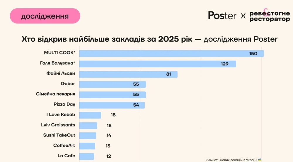 “MULTI COOK”, “Галя Балувана” та “Файні льоди” відкрили у 2025 році найбільшу кількість закладів. “MULTI COOK” відкрив 150 нових локацій в Україні, також компанія повідомила про 40 відкриттів за кордоном, зазначає українська компанія з автоматизації закладів Poster.