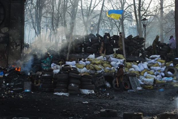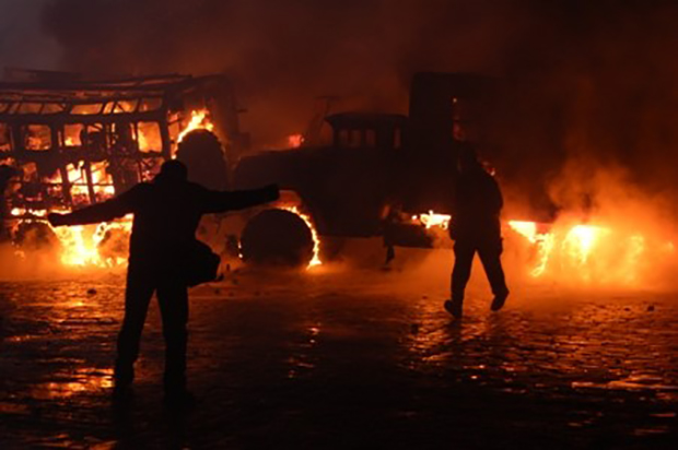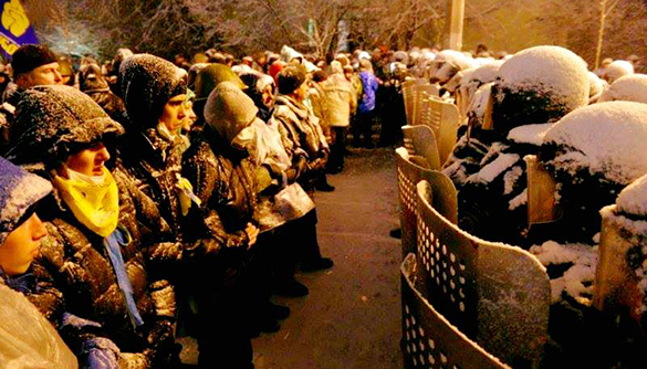- протистояння на Майдані тривало усю ніч. Мітингувальники стримували силовиків за допомогою барикад із палаючих автомобільних шин. “Беркут” серйозно відтіснив євромайданівців. Лінія протистояння змістилася майже до центру Майдану Незалежності.