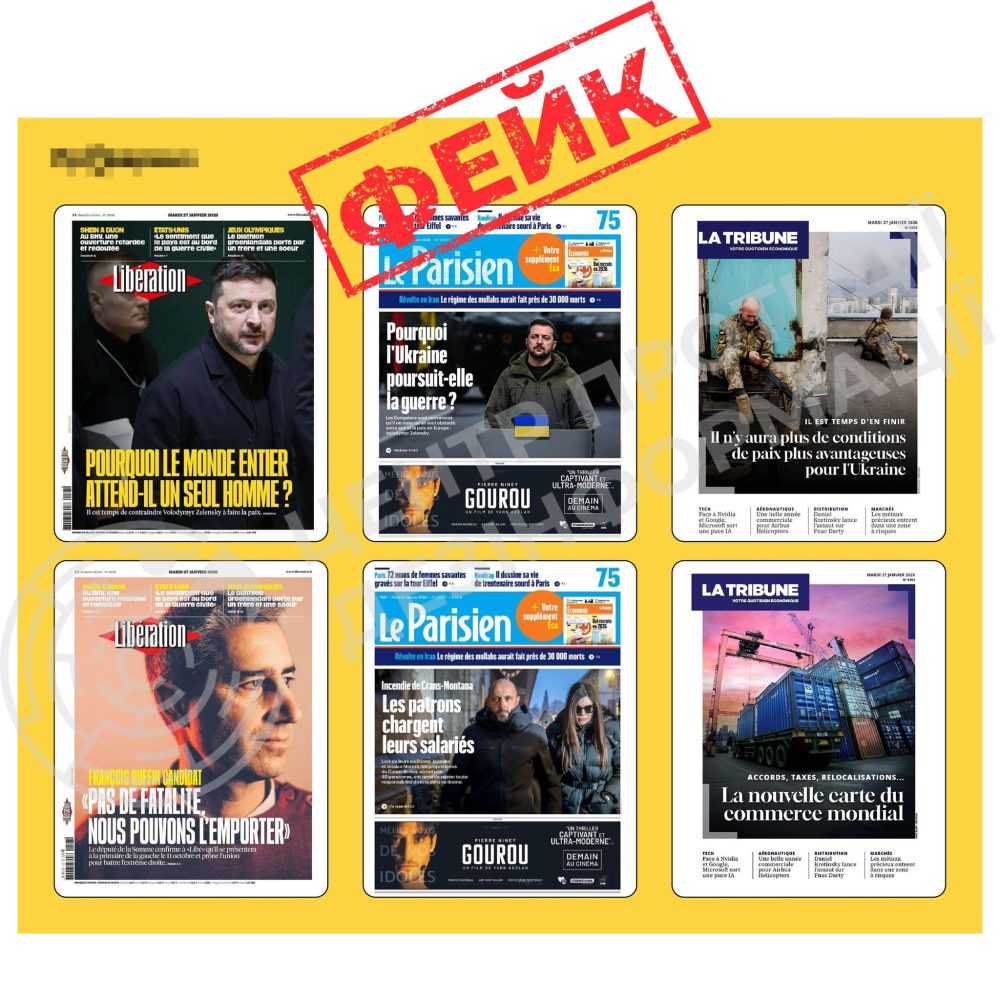 ✅ Насправді жодне з цих французьких медіа не публікувало таких матеріалів. У випусках газет за 27 січня на першу шпальту були винесені матеріали на інші теми. Фейкові обкладинки створені шляхом заміни центрального зображення та заголовка, тоді як інші елементи верстки — шрифти, підзаголовки, вихідні дані — повністю скопійовані з оригіналів.
