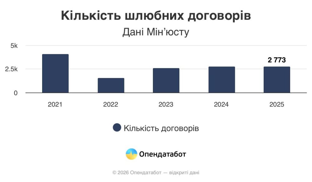 2 773 пари уклали торік шлюбні договори та засвідчили їх у нотаріусів. Це стільки ж, як й у 2024, однак на третину менше до 2021 року.