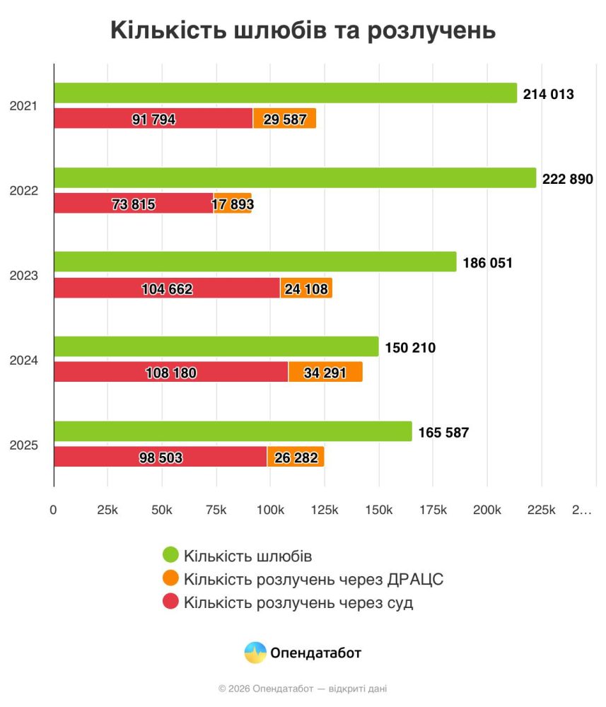Понад 165 тисяч шлюбів та 124 тисячі розлучень зафіксували в Україні у 2025 році за даними Міністерства юстиції України та ДСА. Шлюбів побільшало на 10% за рік, водночас розлучень стало менше на 12%. Наразі на 10 шлюбів припадає 7 розлучень. Кожна четверта нова родина утворилася у Києві. Загалом шлюбів побільшало лише у 3 регіонах: Київ, Дніпропетровщина та Львівщина. А кожне п’яте розлучення відбулося через ДРАЦС.