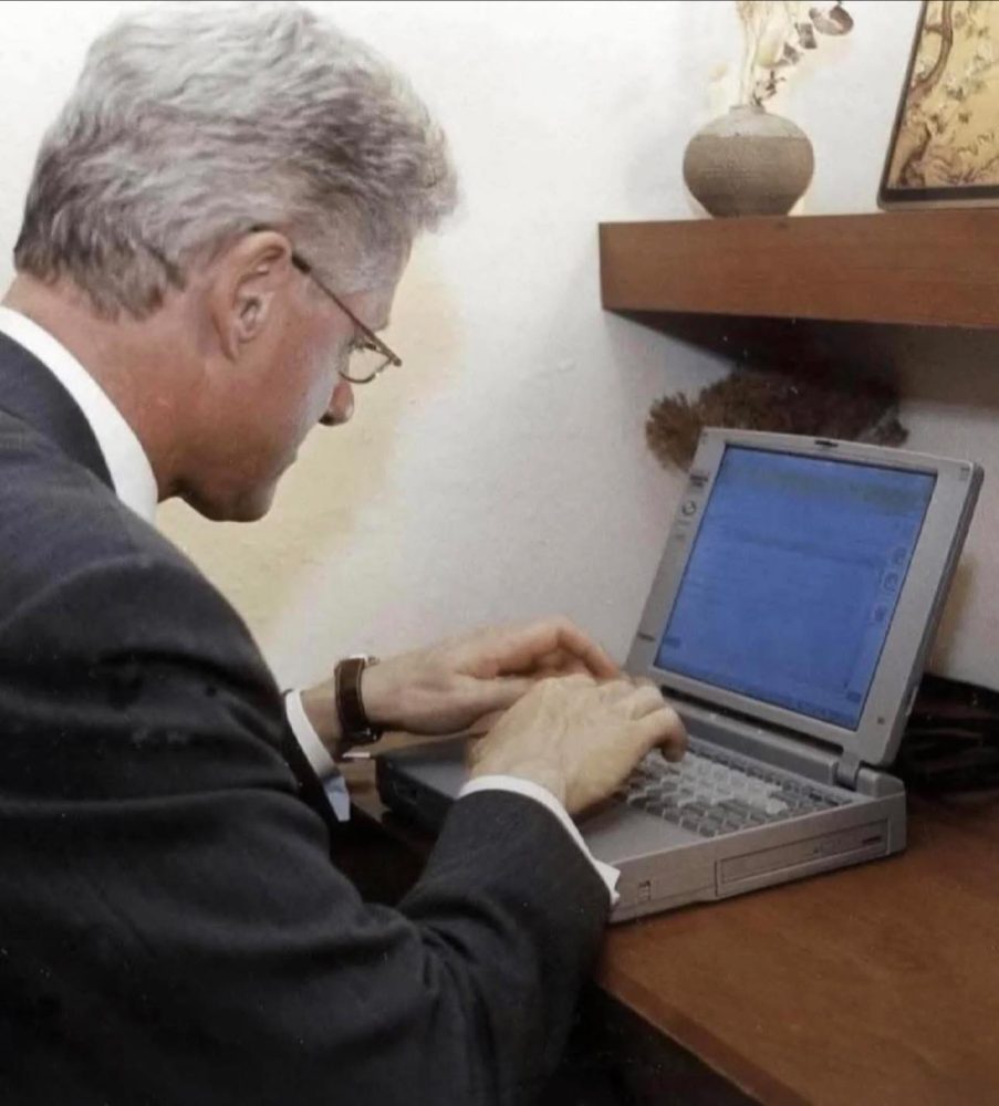 Цікава деталь: оскільки президент не користувався комп’ютером, його штату довелося терміново шукати ноутбук. В результаті Клінтон скористався пристроєм Toshiba Satellite, який належав його особистому лікарю.
