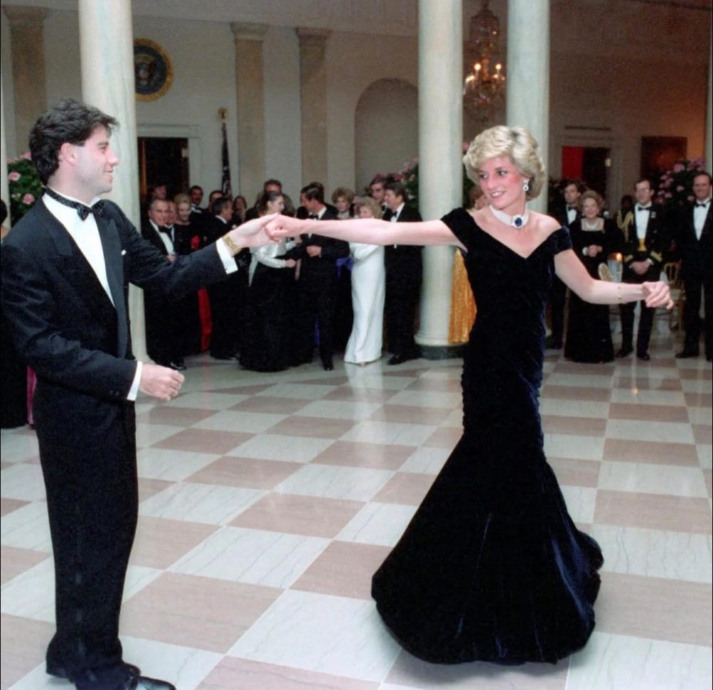 Цей знімок, зроблений 9 листопада 1985 року, став одним із найбільш впізнаваних кадрів XX століття. На державному обіді у президента Рональда Рейгана принцеса Діана у своїй знаменитій темно-синій оксамитовій сукні кружляла в танці з головною зіркою Голлівуду того часу. Траволта пізніше згадував, що це був момент, схожий на казку: Діана сама підійшла до нього, і вони танцювали під музику з його фільму «Лихоманка суботнього вечора».