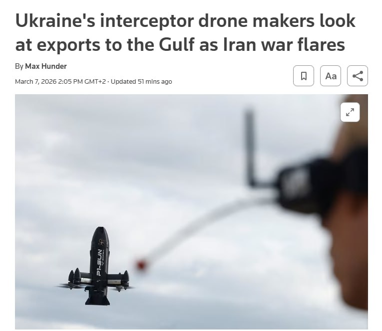 Українські виробники недорогих дронів-перехоплювачів заявляють про свою здатність експортувати великі обсяги продукції країнам Близького Сходу та США, – Reuters