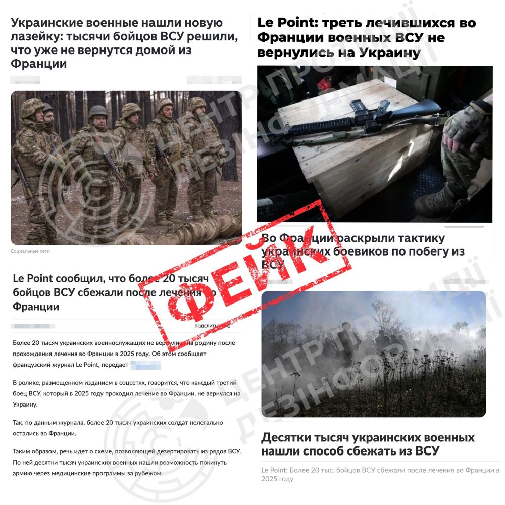 ▫️У повідомленнях стверджується, що буцімто «кожен третій військовий, який проходив лікування у Франції, не повернувся в Україну», а загальна кількість таких випадків нібито перевищує 20 тисяч. Джерелом називають французьке видання Le Point.